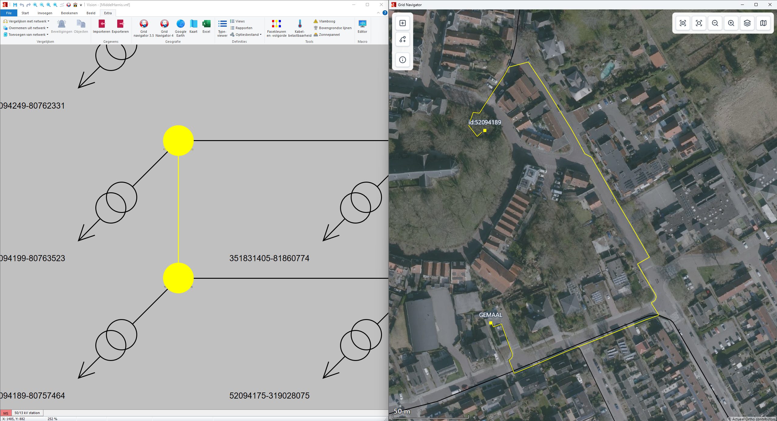 Het programma toont de relevante delen van het netwerk die tegelijkertijd schematisch getekend worden in Vision Network Analysis en geografisch in Vision Grid Navigator. Vanuit beide programma’s kunt u selecties maken en aanpassingen doen in het netwerk.