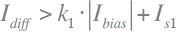 By the ‘dual slope’ bias technique (see figure 6.18), the differential protection has been made less sensitive to through faults and measurement errors (such as saturation) of the current transformers. The sensitivity of the protection depends on a bias current. For small currents, the bias is small. As the current increases, the bias becomes larger. Figure 6.18 illustrates this.