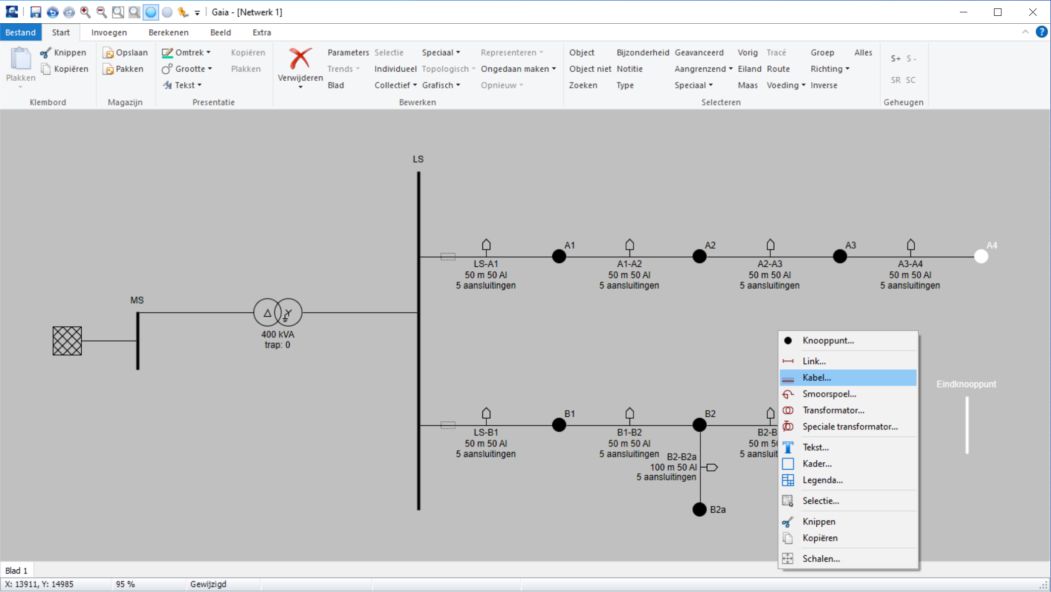 Eerst wordt tussen knooppunt "A4" en "Eindknooppunt" een kabelverbinding aangebracht. Dit kan nadat de twee knooppunten geselecteerd zijn. Om te selecteren worden beide knooppunten met de linkermuisknop aangeklikt terwijl de Ctrl-toets ingedrukt is. Geselecteerde knooppunten zijn in het wit weergegeven.