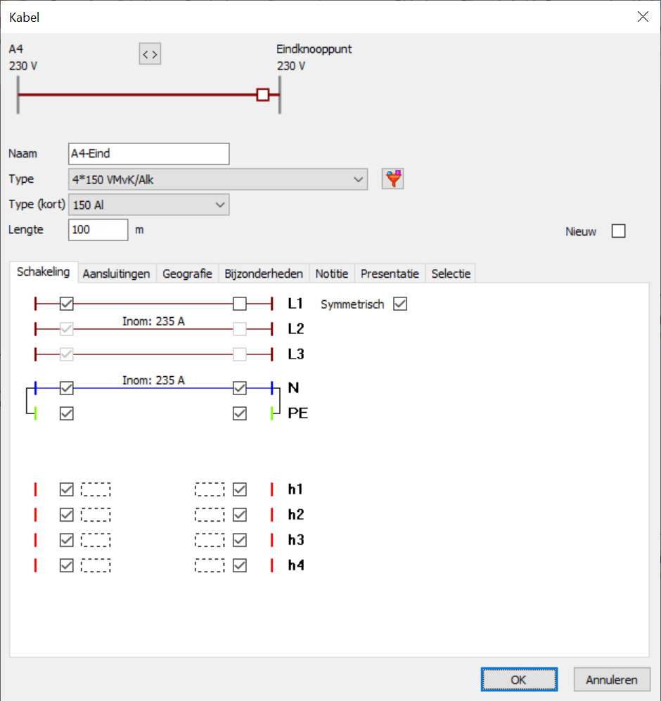 Als gevolg is de kabel met aan één zijde geopende schakelaars ingevoegd tussen de knooppunten "A4" en "Eindknooppunt". De geopende schakelaar is zichtbaar als een open vierkantje. In de opties kan ook gekozen worden voor een ander symbool (vlag of schuin streepje).