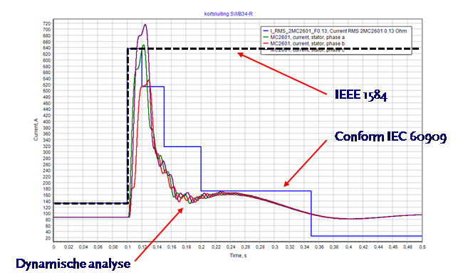 De vlamboogberekening in Vision is NIET geheel conform de IEEE 1584 norm. Dit heeft te maken met de wijze waarop de kortsluitbijdrage van asynchrone machines meegenomen is in de berekening. De norm neemt de afname van de motorbijdrage niet mee in de berekening, het gevolg hiervan is dat bij grotere industriële netwerken de vlamboogenergie onrealistisch hoog uitvalt. In Vision is de afname van deze kortsluitstromen meegenomen zoals de IEC deze voorschrijft in de IEC 60909. Hieronder zijn de motorstromen geplot direct voor en na de kortsluiting op t = 100 ms. De zwarte stippellijn representeert de contributie zoals meegenomen in de berekening conform de IEEE 1584, de blauwe lijn representeert de RMS stroom zoals deze in de vlamboogmodule binnen Vision geïmplementeerd is en de groene, rode en magenta lijn zijn de stromen van respectievelijk fase a, b en c van een dynamische studie.